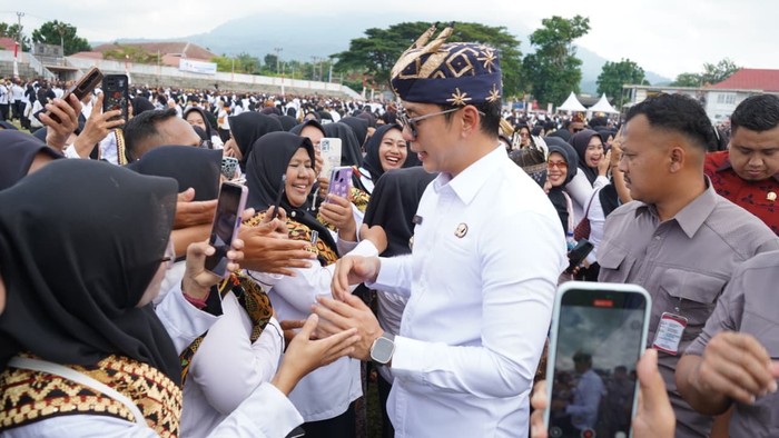 Ribuan penerima SK tampak kompak mengenakan kemeja putih dan celana hitam. Nuansa khidmat semakin terasa dengan sentuhan aksesori adat daerah, seperti Tukus bagi laki-laki dan selendang Tapis bagi perempuan, sebagai simbol kebanggaan identitas dan kebersamaan.