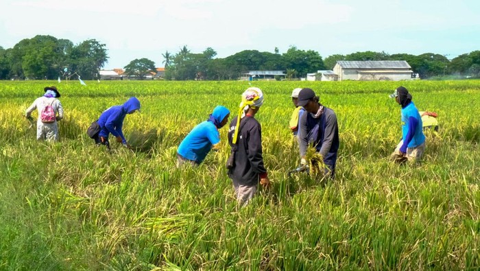 Padi hasil panen yang telah dikeringkan tidak digiling menggunakan mesin, melainkan ditumbuk secara tradisional menggunakan lesung dan alu. Suara dentuman kayu yang beradu menciptakan irama khas yang menandakan sukacita.