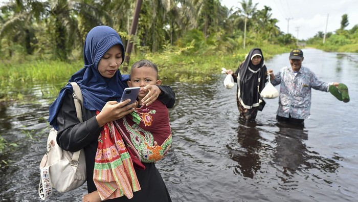 Tanjabtim – Warga berjalan menerobos banjir luapan Sungai Dendang di Desa Catur Rahayu, Tanjung Jabung Timur, Jambi, Sabtu (10/1/2026).