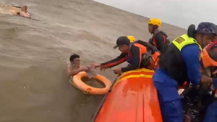 Kapal muatan barang tenggelam akibat dihantam ombak di Perairan Kuala Duri Kabupaten Tanjung Jabung Barat, Jambi. Tiga orang anak buah kapal (ABK) berjam-jam terombang-ambing di tengah laut hingga berhasil diselamatkan secara dramatis oleh tim SAR.